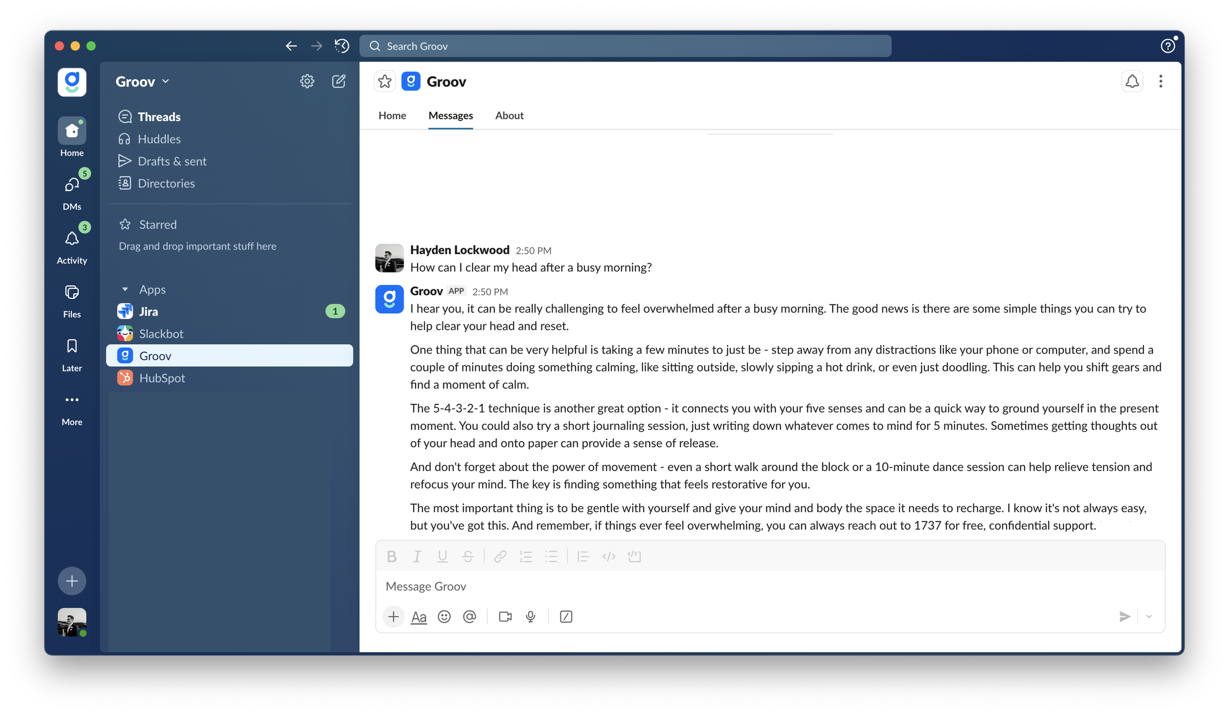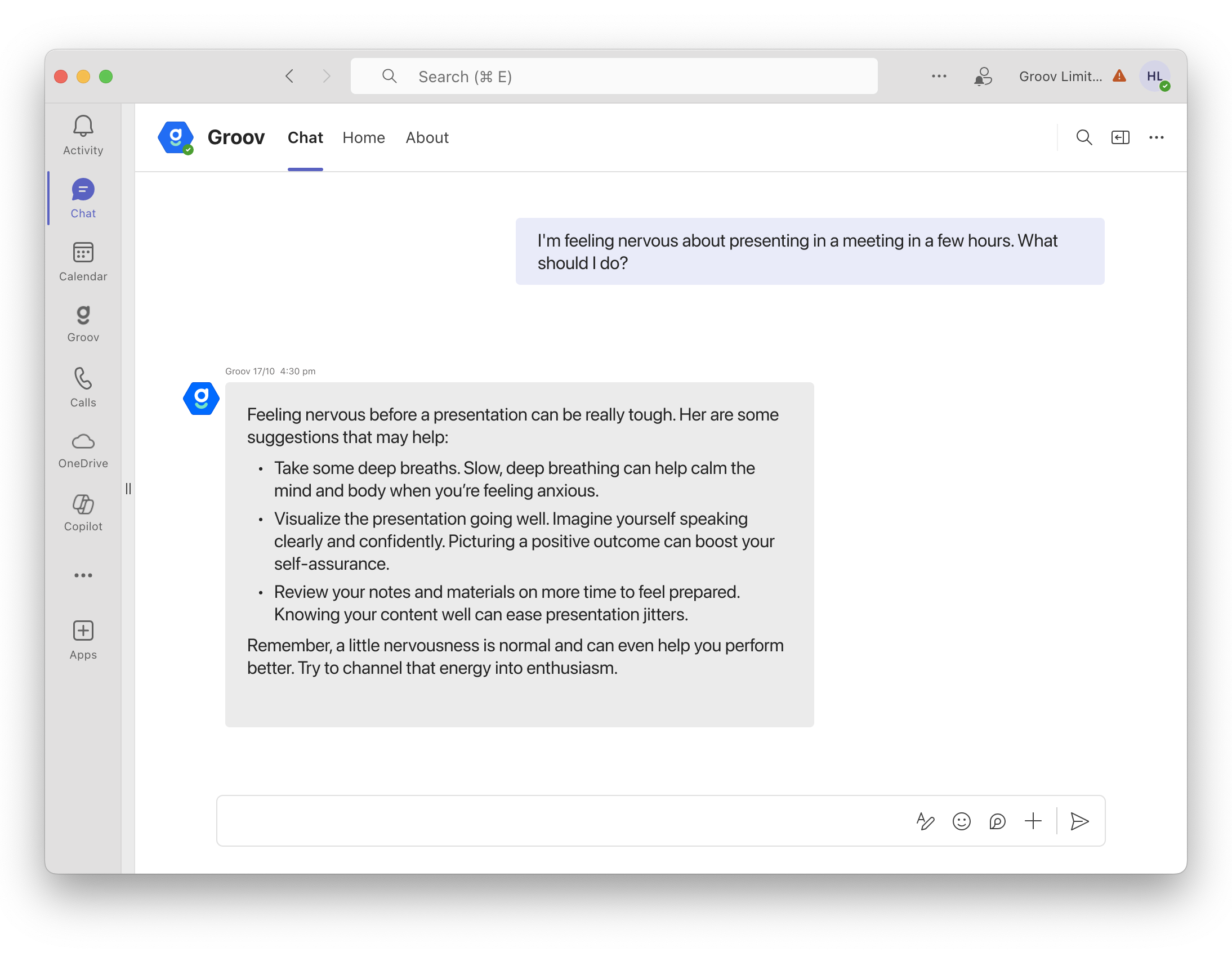 Ask Groov for Work is an AI-powered support tool available 24/7 in MS Teams. It’s built to give you safe, practical answers to everyday work and life questions.