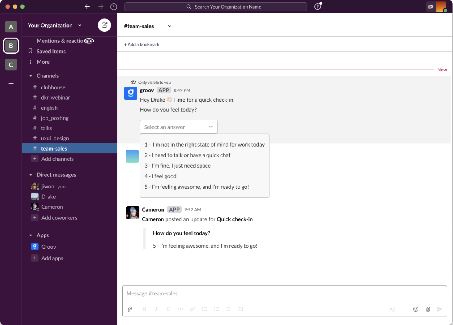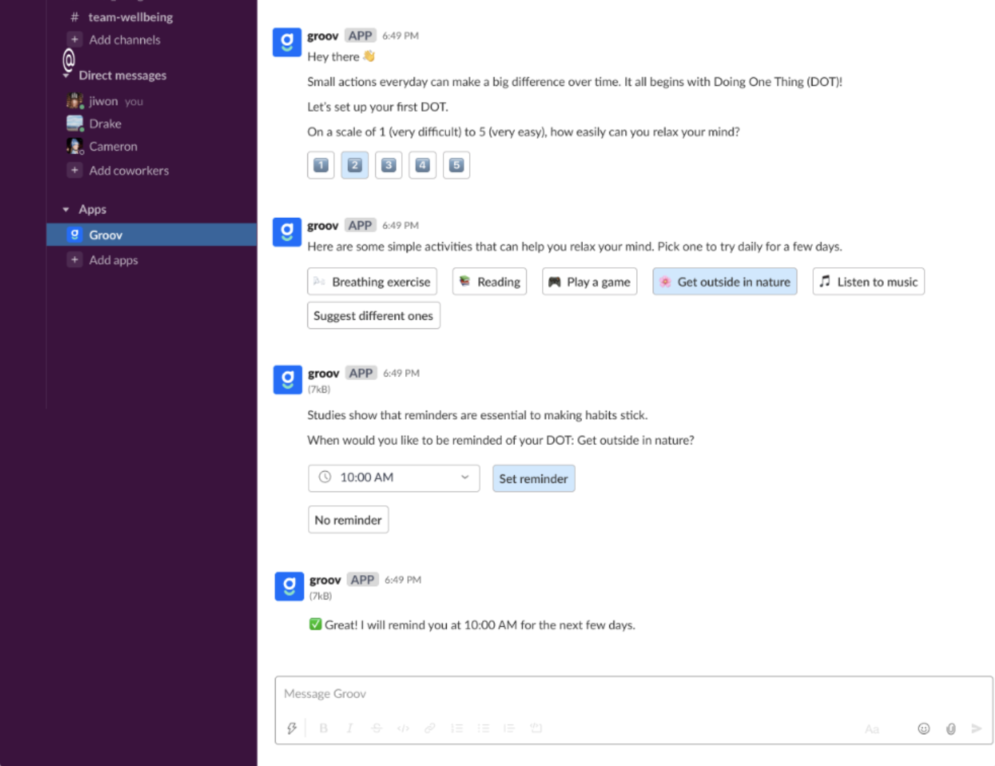 Groov sits within your messaging tools like MS Teams and Slack to schedule experiences for you and your team. Daily check-ins, recharges and more to help you take care of yourself.